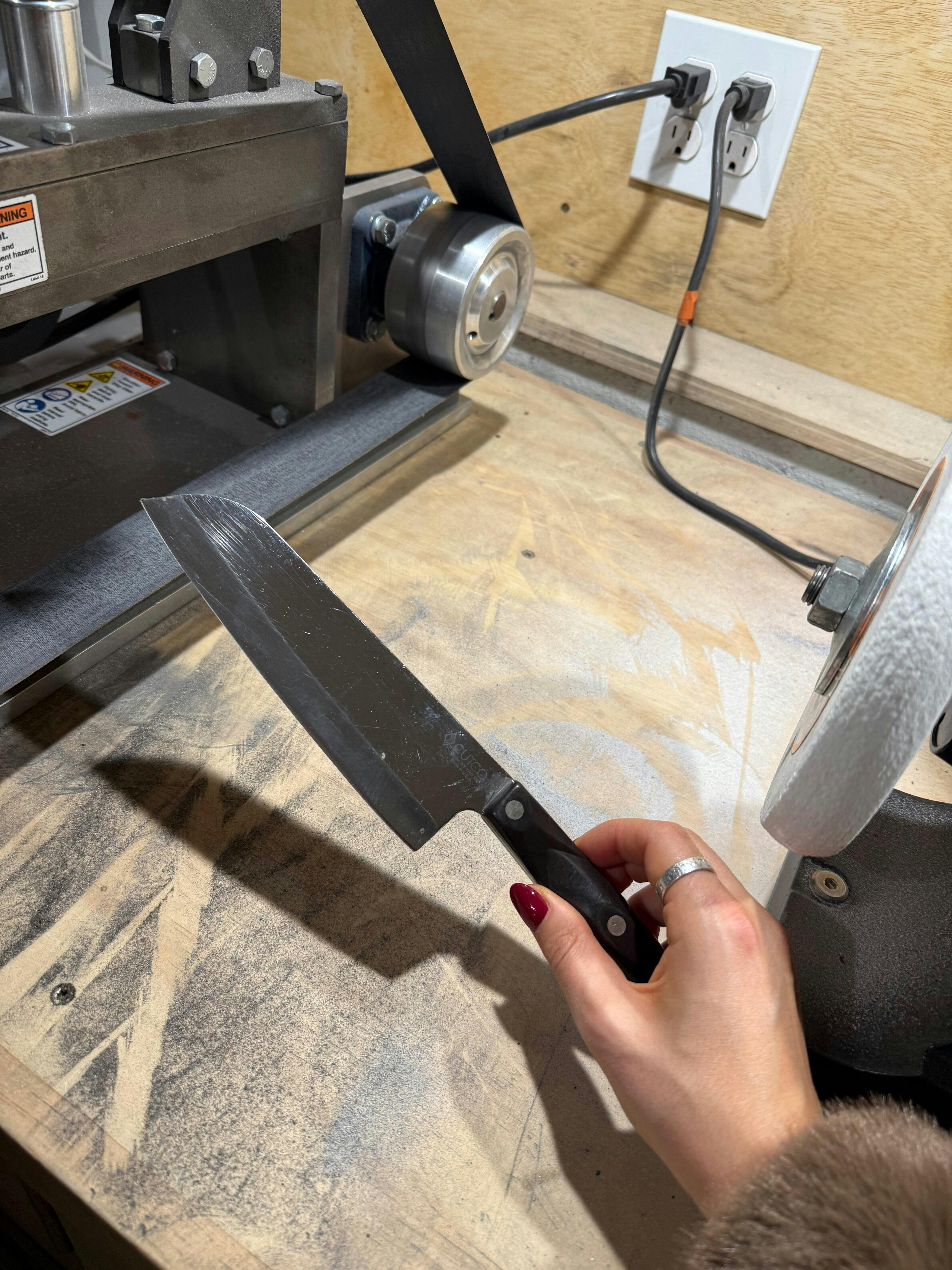 The main sharpening process is done entirely by hand using air-cooled ceramic belts, precision bench grinders, and ultra-fine Japanese whetstones. For repairs, thinning, or edge re-profiling, we adjust our technique to match each knife’s steel type and factory-correct angle.